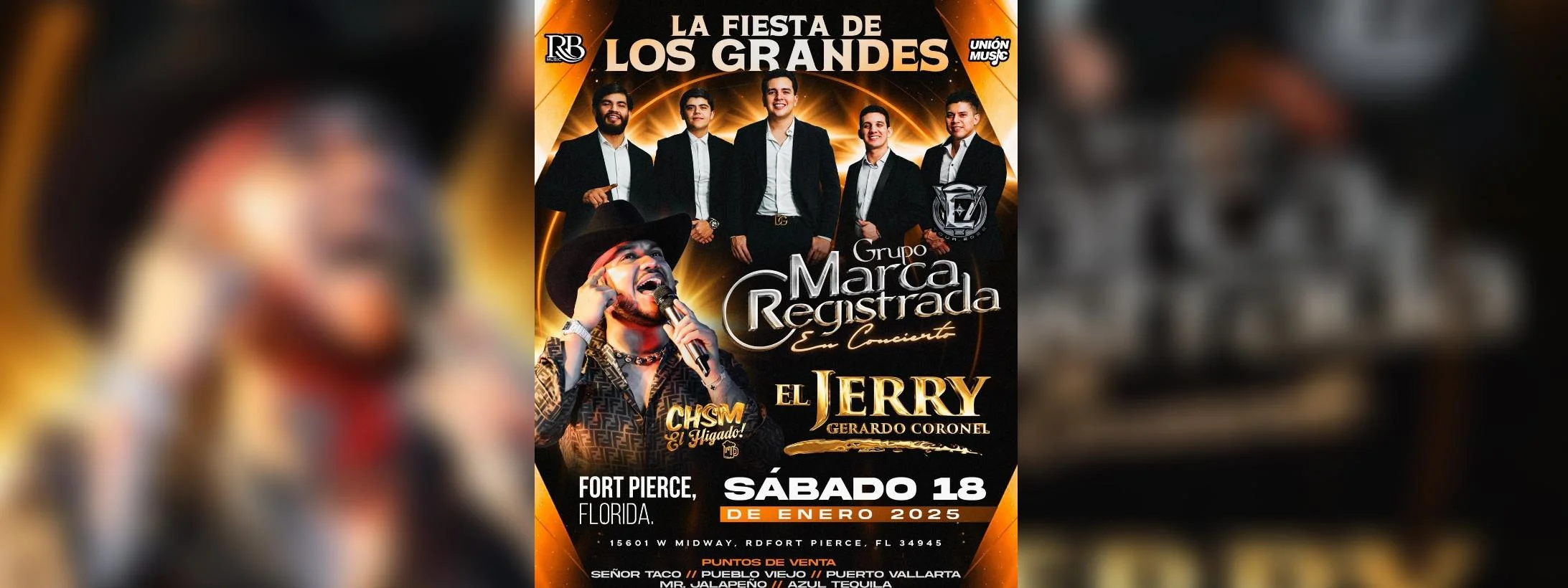 ¡No te pierdas el concierto de MARCA REGISTRADA & GERARDO CORONEL EL JERRY en St Lucie County Fair! Este emocionante evento se llevará a cabo en Fort Pierce, FL el 18 de Enero de 2025 a las 2:00. Te prometemos una noche llena de música y diversión con las actuaciones de Grupo Marca Registrada, Gerardo Coronel «El Jerry» y Desmadre Band. ¡Es un concierto para todas las edades, así que invita a toda la familia! Para comprar tus boletos, visita nuestra página web Ticketón. ¡No pierdas esta oportunidad única de disfrutar de un gran concierto en vivo, te esperamos!